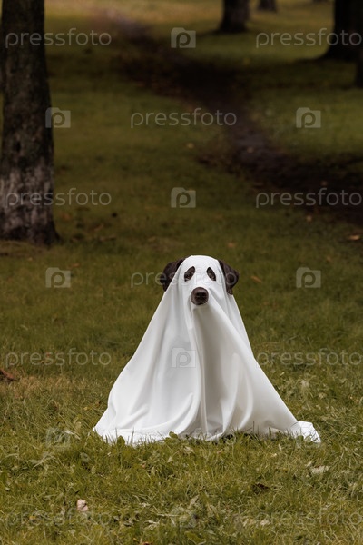 Милый лабрадорский пес, одетый в костюм призрака на Хэллоуин
