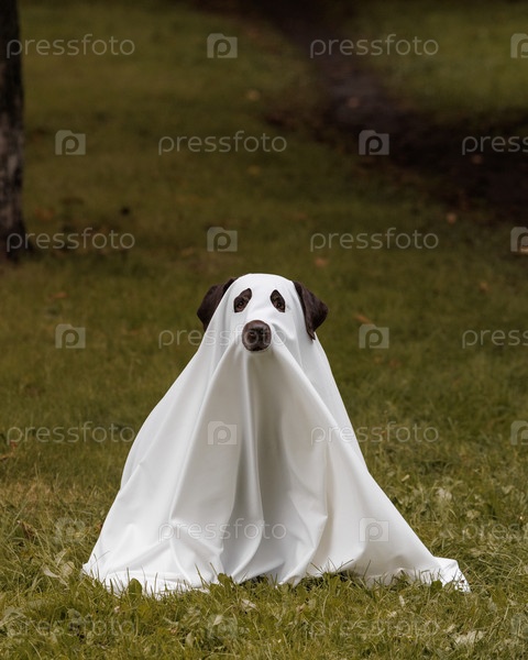 Милый лабрадорский пес, одетый в костюм призрака на Хэллоуин