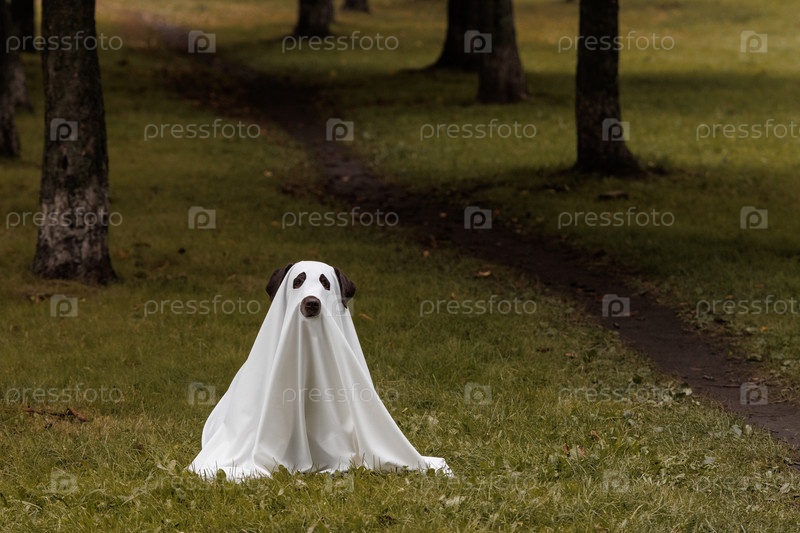 Милый лабрадорский пес, одетый в костюм призрака на Хэллоуин