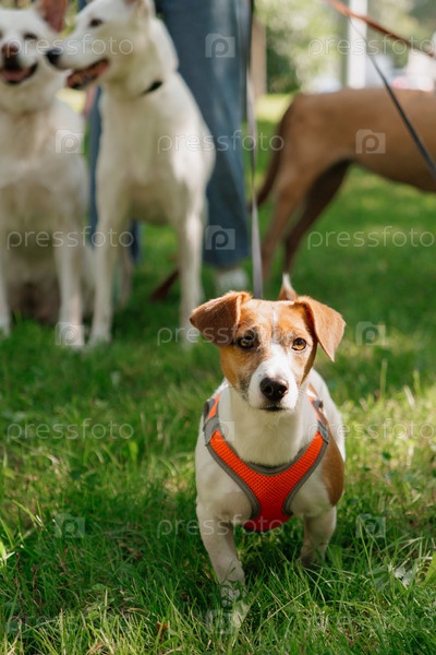 Собака-терьер Джек Расселл в парке на проводе со своим хозяином