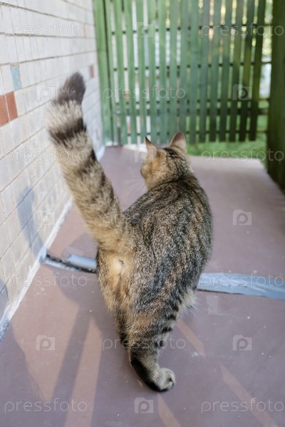 Полосатый кот на балконе, сидящий на подоконнике у окна. милая кошка отдыхает на террасе или во дворе