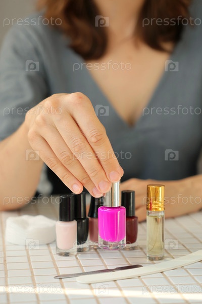 Женщина делает маникюр дома, разрезает кутикулу. человек выбирает лак для ногтей для окрашивания