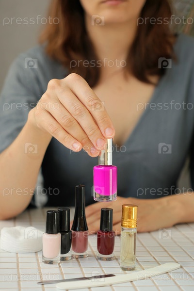 Женщина делает маникюр дома, разрезает кутикулу. человек выбирает лак для ногтей для окрашивания