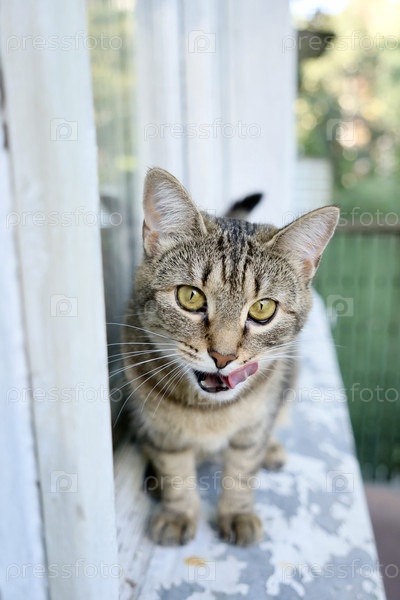 Полосатый кот на балконе, сидящий на подоконнике у окна. милая кошка отдыхает на террасе или во дворе
