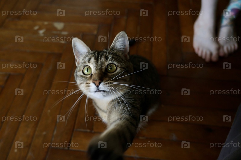 Полосатый домашний кот отдыхает и играет дома. милый пушистый питомец сидит на паркете или диване