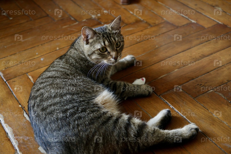 Полосатый домашний кот отдыхает и играет дома. милый пушистый питомец сидит на паркете или диване