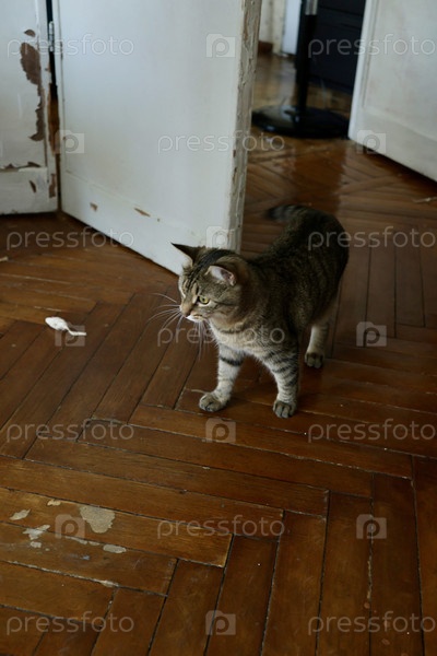 Полосатый домашний кот отдыхает и играет дома. милый пушистый питомец сидит на паркете или диване