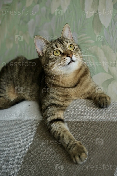 Полосатый домашний кот отдыхает и играет дома. милый пушистый питомец сидит на паркете или диване