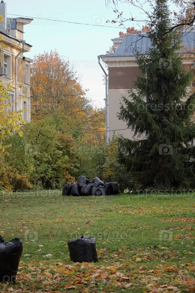 Мусор в черных пластиковых пакетах в саду, во дворе. уборка территории дома в осенний сезон