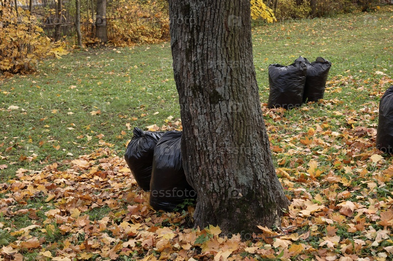 Мусор в черных пластиковых пакетах в саду, во дворе. уборка территории дома в осенний сезон