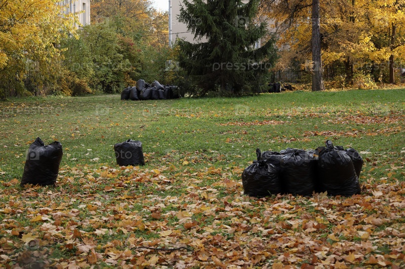 Мусор в черных пластиковых пакетах в саду, во дворе. уборка территории дома в осенний сезон