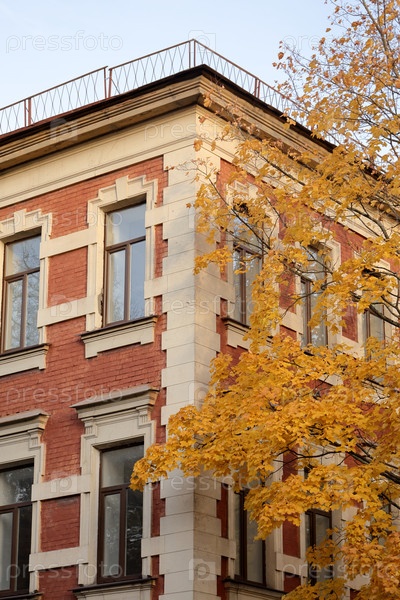 Фасад исторического здания - дерево с осенними желтыми листьями. кирпичный дом историческая архитектура