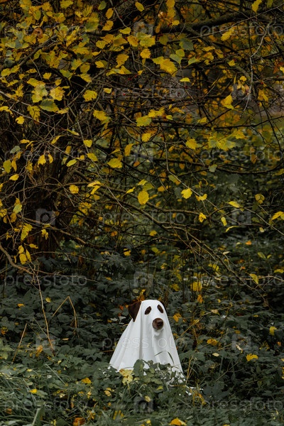 Лабрадорская собака, одетая как призрак Хэллоуина, питомец в белом плаще