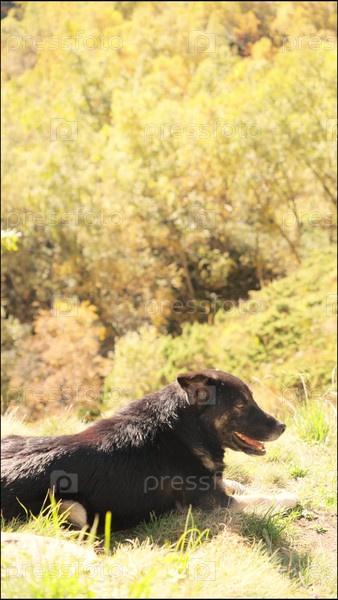 Черная собака сидит на фоне гор и смотрит в даль, домашний питомец музы