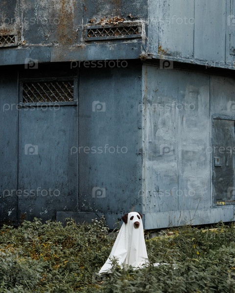 Милая лабрадорская собака, одетая как призрак Хэллоуина, домашний любимец в белом плаще