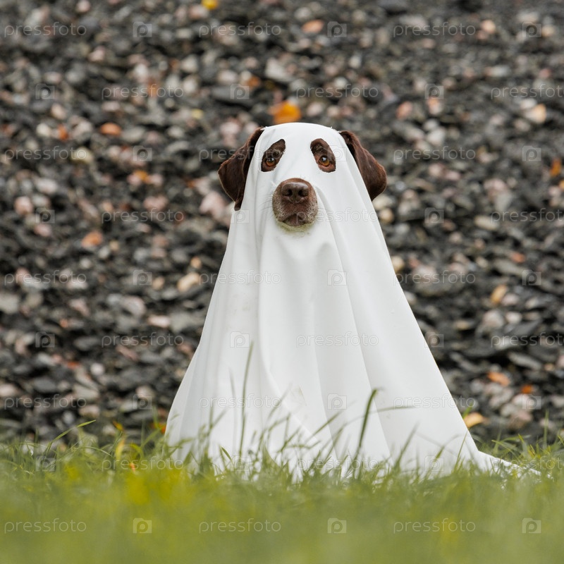 Милая лабрадорская собака, одетая как призрак Хэллоуина, сидит в осеннем парке