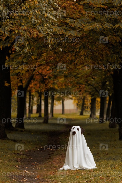 Милый лабрадорский пес, одетый в костюм призрака на Хэллоуин