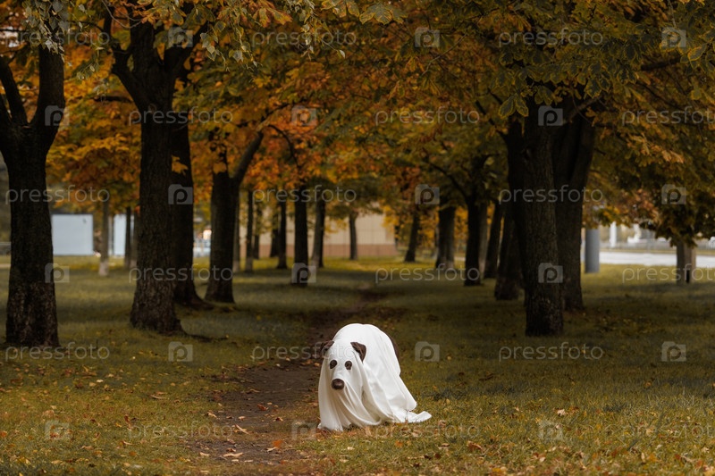 Лабрадорская собака, одетая как призрак на вечеринку или Хэллоуин, питомец в белом плаще стоит в парке