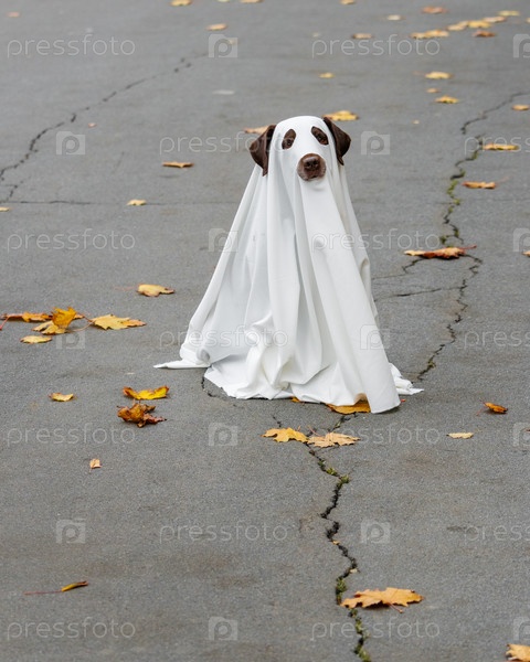 Лабрадорская собака, одетая в костюм Хэллоуина, призрачный питомец в белом плаще сидит на трещинах дороги
