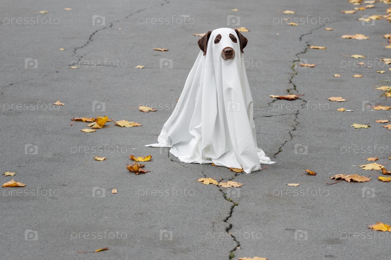 Лабрадорская собака, одетая в костюм Хэллоуина, призрачный питомец в белом плаще сидит на трещинах дороги