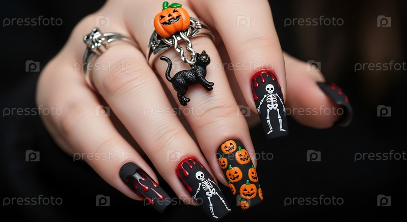 Рука женщины украшена жуткими ногтями на тему Хэллоуина и декоративными кольцами