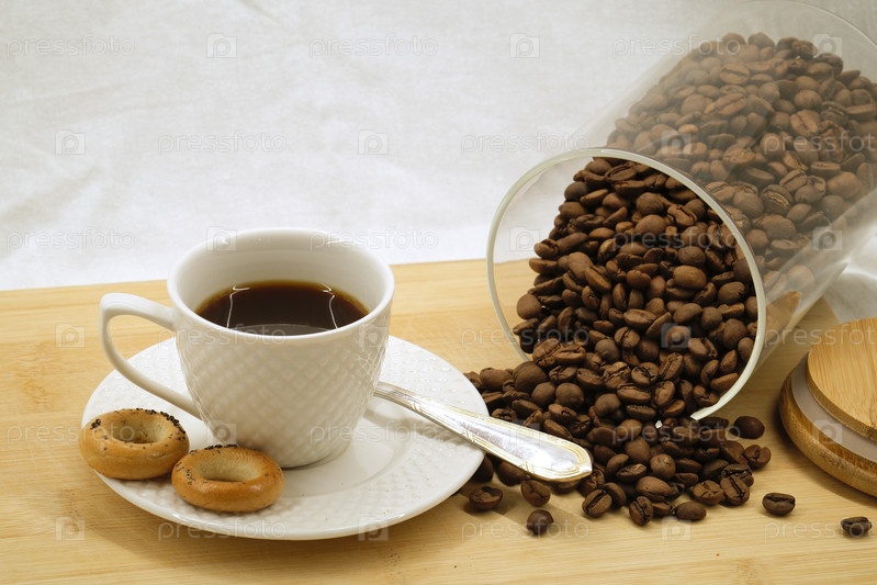 Чашка кофе с сушилкой на тарелке и разбросанными кофейными зернами из стеклянного банка на деревянной поверхности