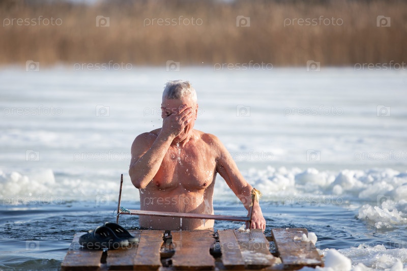 Пожилой мужчина купается в ледяной дыре на православном празднике Богоявления