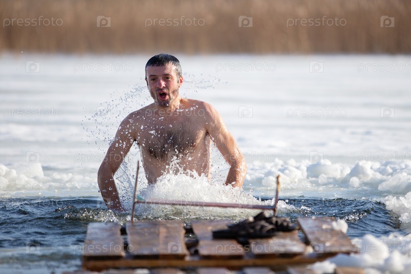 Мужчина купается в ледяной дыре на православном празднике Богоявления