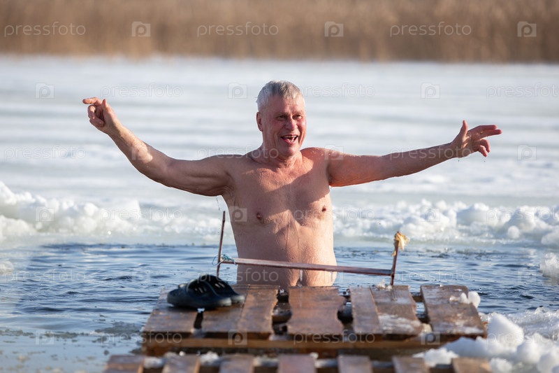 Пожилой мужчина купается в ледяной дыре на православном празднике Богоявления