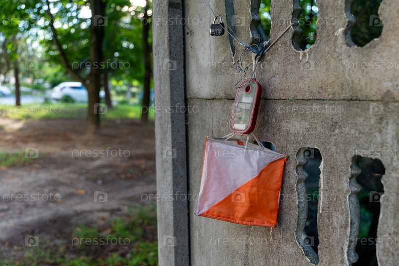 Уличная ориентация с призмовым контрольно-пропускным пунктом и электрическим композитором на бетонном заборе. городские виды спорта, навигация и приключения в открытом воздухе в конкурентной среде
