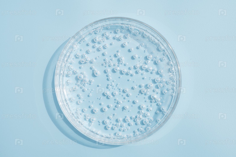 Прозрачные капли сывороточного геля косметический продукт в чашке Петри. жидкая текстура с пузырями на синем фоне. средства по уходу за кожей, натуральная косметика. концепция красоты для лица и тела