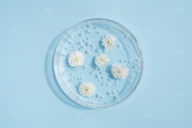 Чашка Петри с косметическим гелем и белыми цветами на синем. вид сверху, жидкий макияж. травы являются натуральными ингредиентами