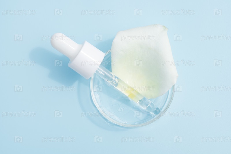 Косметическая пипетка с сывороткой в чашке Петри на синем фоне. Капля масла для лица. Красота Лицевой косметический продукт текстура верхний вид. Лосьон по уходу за телом с розовым маслом