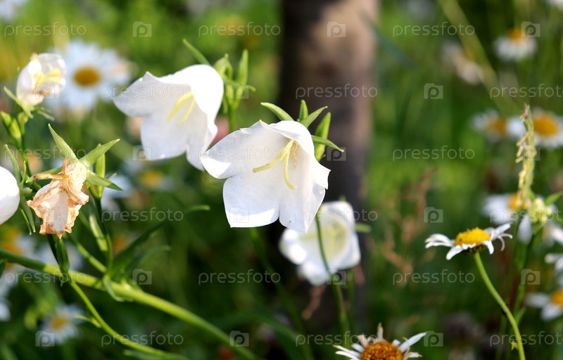 Белые садовые колокола и ромашки в солнечный летний день