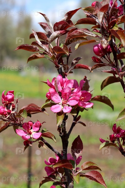 Цветение розовых цветов на яблоне китайского сорта в солнечном свете весеннего дня