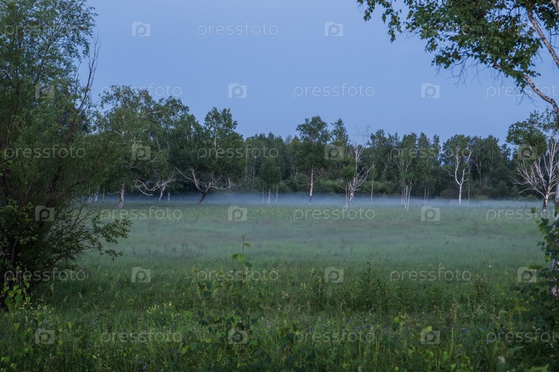 Утренний туман на лугу на краю леса