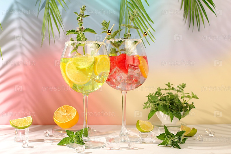 Современный натюрморт с алкогольным коктейлем из арбуза, лимона, льда, текилы, водки и мяты на элегантном фоне, минималистическая концепция бара, рецепт испанской сангрии, рекламный баннер для кафе