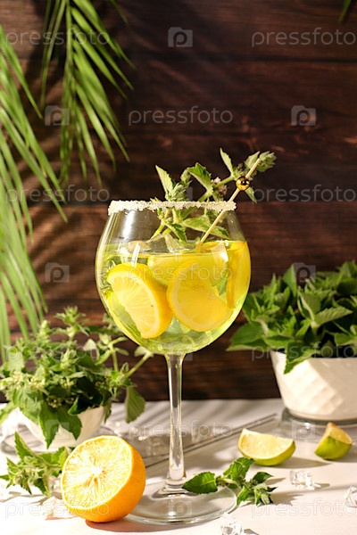 Монета алкогольный или безалкогольный коктейль с лимоном, лаймом и льдом.Минималистская концепция бара, рецепт испанской сангрии, рекламный баннер для кафе.Современные натюрморты с летними напитками детоксикации