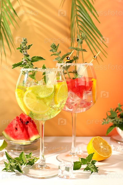 Современный натюрморт с алкогольным коктейлем из арбуза, лимона, льда, текилы, водки и мяты на элегантном фоне, минималистическая концепция бара, рецепт испанской сангрии, рекламный баннер для кафе