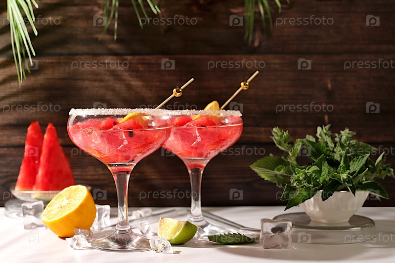 Ледяной пинок с кусочками арбуза, лимона, мяты, льда с текилой, водкой или газированной водой на элегантном фоне, минималистическая барная концепция, безалкогольный напиток для похудения и детоксикационной диеты, рекламный баннер