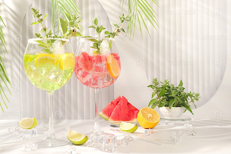 Бокалы с сангрией с лимоном, мятой, арбузом, льдом с текилой, водкой или газированной водой на элегантном фоне, минималистическая концепция бара, безалкогольный напиток для похудения, рекламный баннер в кафе