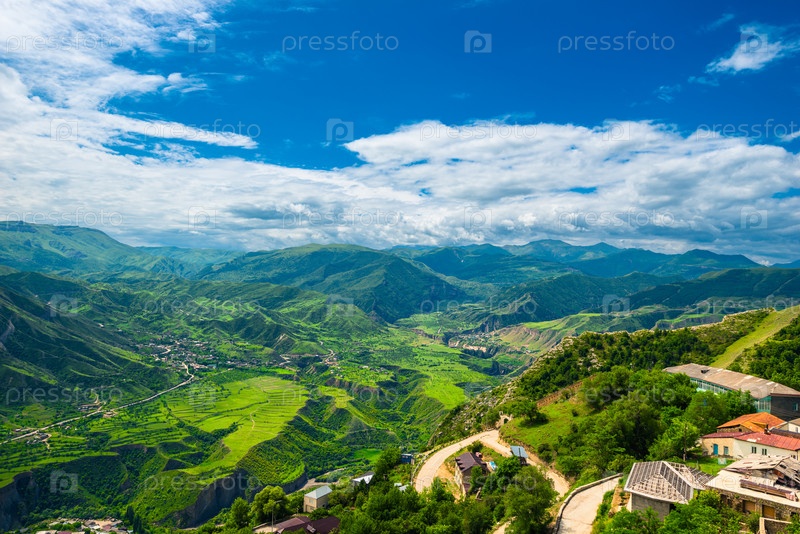 Живописный вид на зеленую горную долину с глубокими ущельями.Дагестан, Кавказ