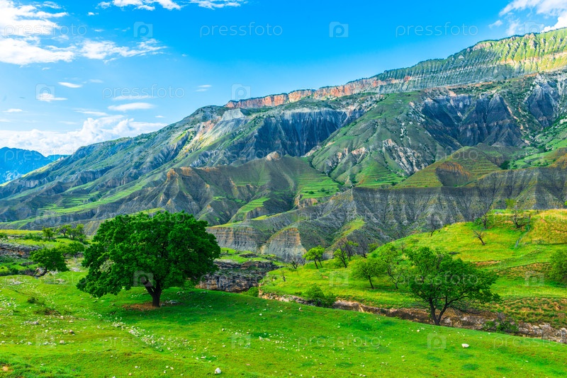Живописный горный пейзаж с одиноким деревом на фоне красивых гор.Дагестан, Кавказ