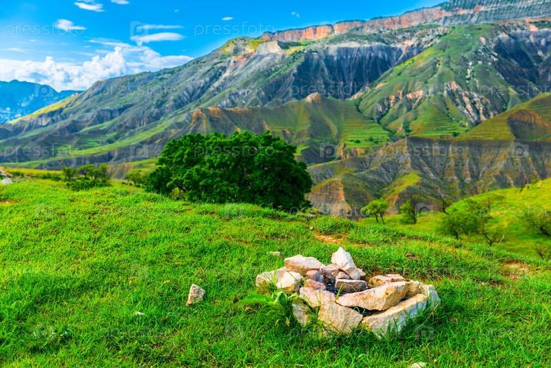 Огненная яма из камней на фоне красивых гор Кавказа.Дагестан