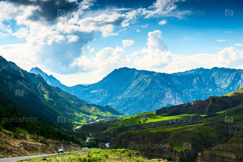 Красивый горный пейзаж с дорогой среди зеленых гор в Дагестане. Кавказ