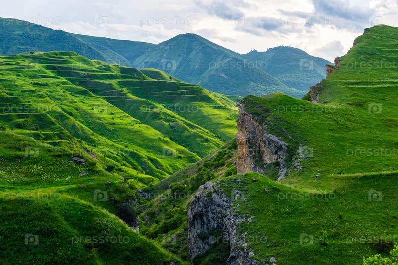 Красивый горный пейзаж с зелеными склонами террасовых гор.Северный Кавказ