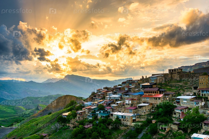 Живописный закат солнца над горной деревней Чох.Кавказ