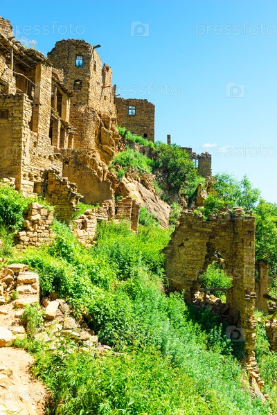 Каменные руины в горной деревне-призраке Гамсутль, на Кавказе