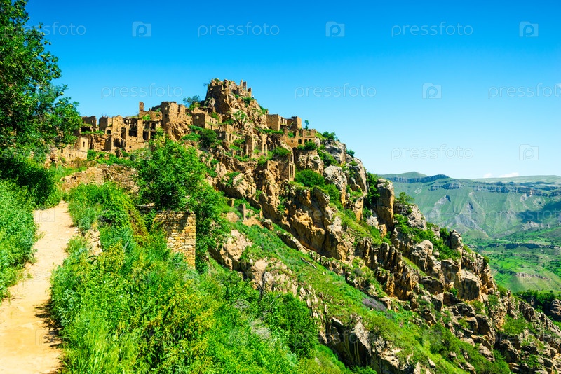 Ландшафт с тропой, ведущей к руинам горной деревни-призрака Гамсутль. Северный Кавказ