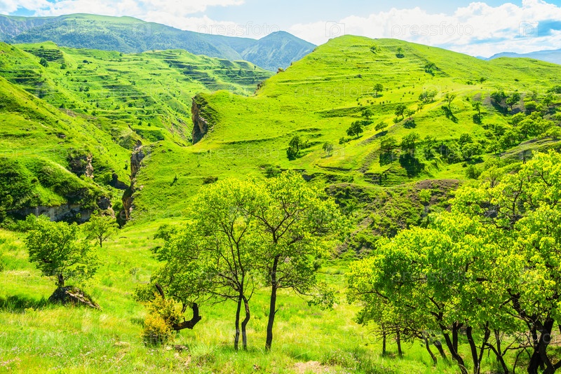 Живописный пейзаж идеалистического ландшафта зеленых гор в солнечную погоду